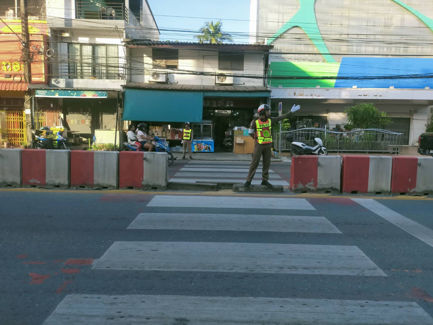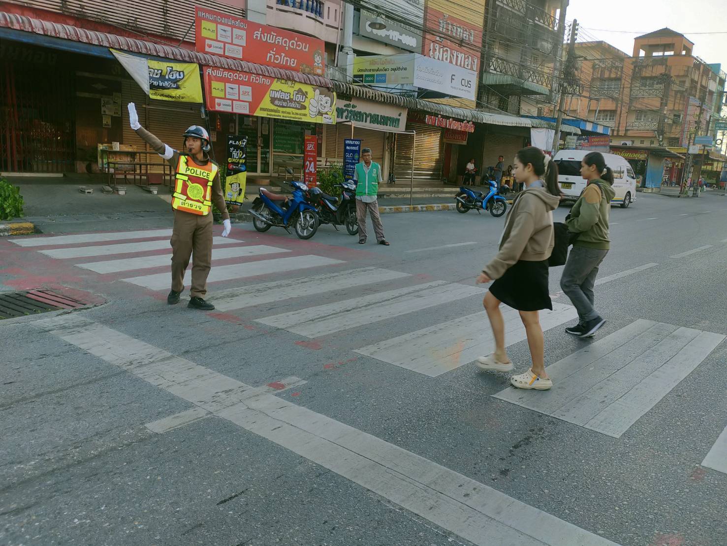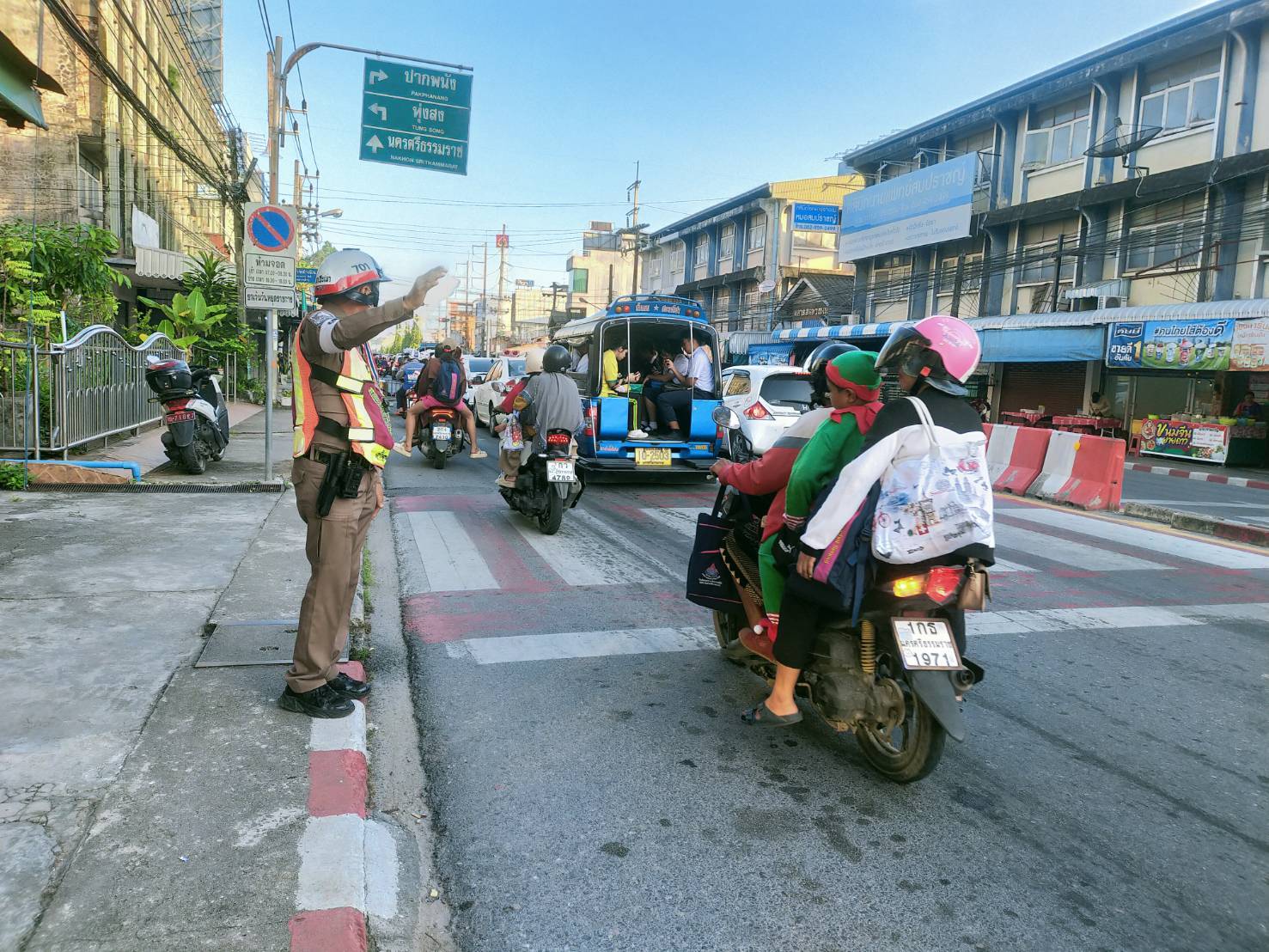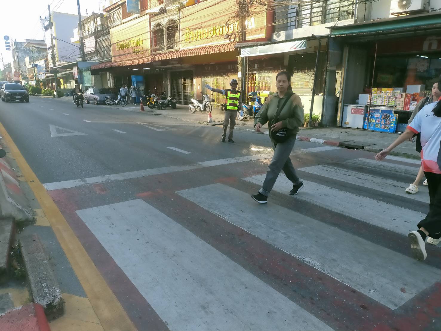 นสต.ชัยพร ชูเพชร อาสาจราจร ปฎิบัติหน้าที่การจราราจรอำนวยความสะดวกทางข้ามม้าลายแยกขาเข้าเมือง ขาออกเมือง