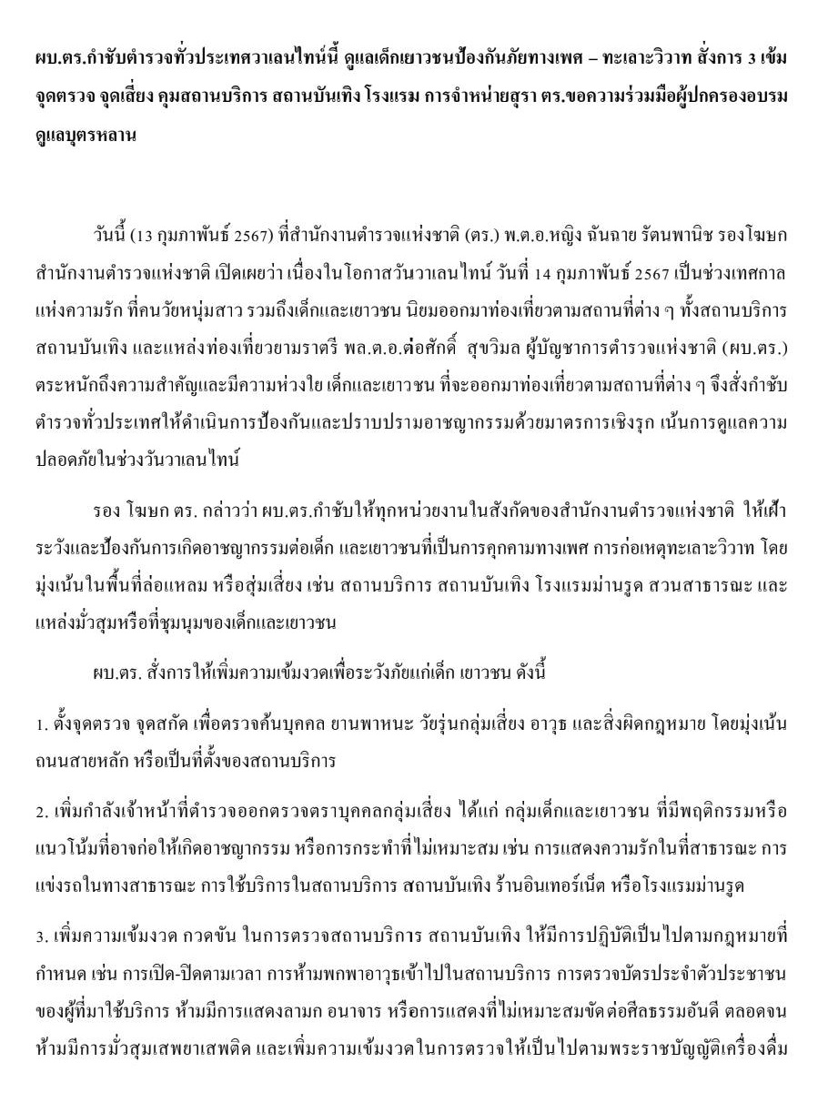 ผบ.ตร.กำชับตำรวจทั่วประเทศวาเลนไทน์นี้ดูแลเด็กเยำวชนป้องกันภัยทางเพศ – ทะเลาะวิวาท สั่งการ 3 เข้มจุดตรวจจุดเสี่ยง คุมสถานบริการ สถานบันเทิง โรงแรม การจำหน่ายสุรา ตร.ขอความร่วมมือผู้ปกครองอบรมดูแลบุตรหลาน 14 กุมภาพันธ์ 256714 กุมภาพันธ์ 2024 SURIYA CHAIPAHOL ข่าวประชาสัมพันธ์