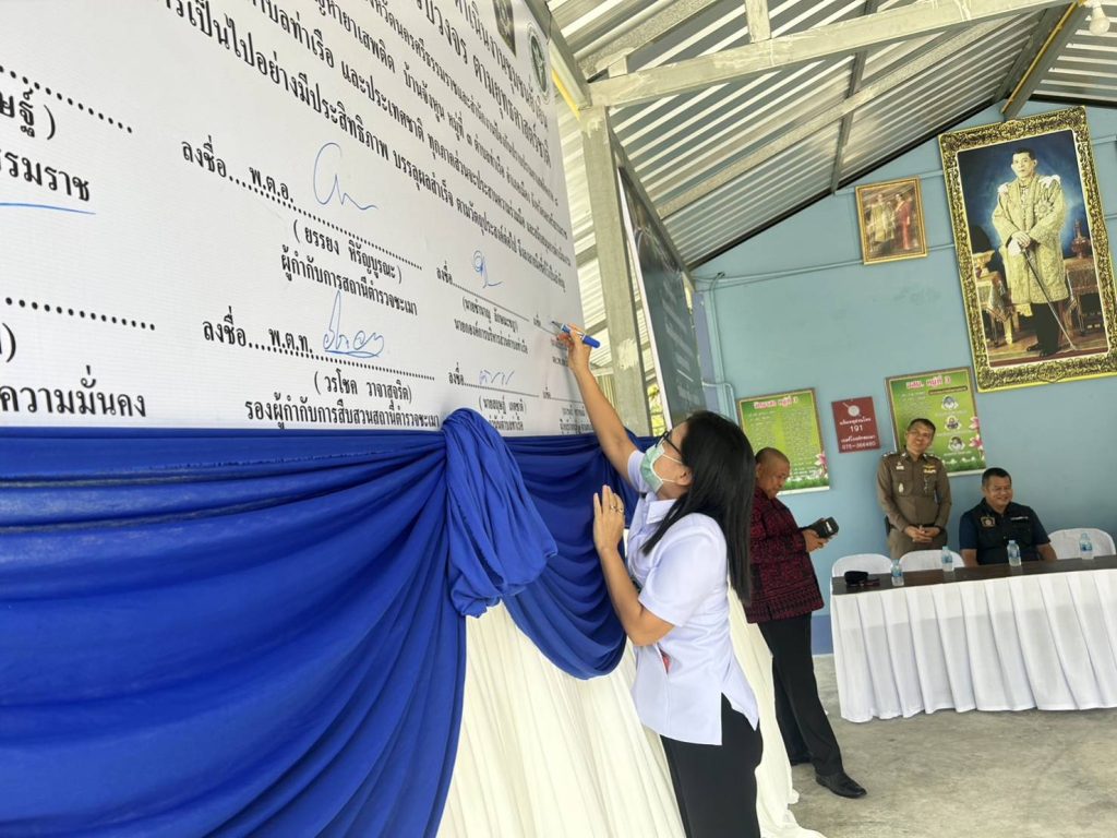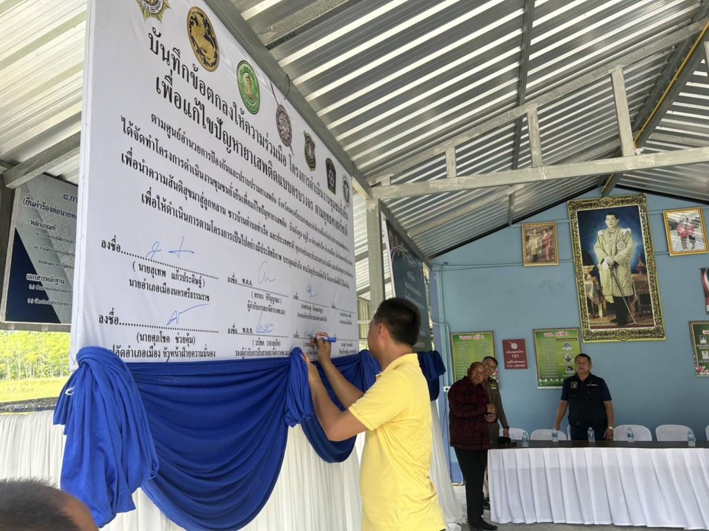 มี พ.ต.อ.ยรรยง หิรัญบูรณะ ผกก.สภ.ชะเมา , พ.ต.ท.วรโชค วาจาสุจริต รอง ผกก.สส.สภ.ชะเมา , นายศุภโชค ช่วยคุ้ม ปลัดอำเภอเมือง หัวหน้าฝ่ายความมั่นคง , นายชำนาญ ลักษณะชฎา นายกองค์การบริหารส่วนตำบลท่าเรือ , นางฉวีวรรณ แซ่ซี่ ผอ.รพ.สต.บ้านพังสิงห์ , นายสฤษฎ์ เกตุชาติ กำนันตำบลท่าเรือ , นางนุจรี พราหมณี ผู้ใหญ่บ้าน ม.3 ต.ท่าเรือ ร่วมลงนามบันทึกข้อตกลง(MOU) โครงการดำเนินงานชุมชนยั่งยืน ฯ