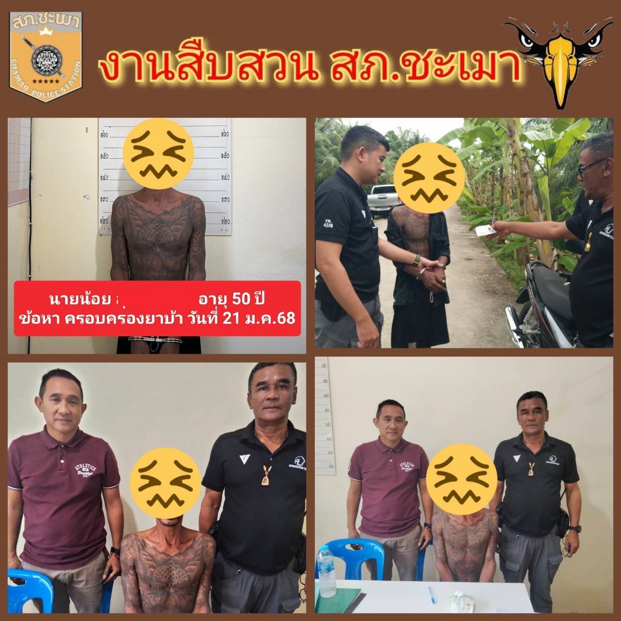 สืบสวน สภ.ชะเมา ได้ร่วมจับกุม นายน้อย อายุ 50 ปี มีและเสพยาเสพติดให้โทษประเภท 1 (เมทเอมเฟตามีน) โดยไม่ได้รับอนุญาต