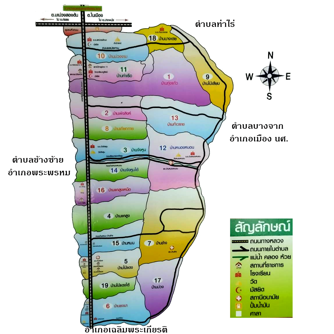 ทิศเหนือ : จดตำบลในเมือง อำเภอเมือง จังหวัดนครศรีธรรมราช ทิศใต้ : จดตำบลทางพูน อำเภอเฉลิมพระเกียรติ จังหวัดนครศรีธรรมราช ทิศตะวันออก : จดตำบลชะเมา อำเภอปากพนัง จังหวัดนครศรีธรรมราช ทิศตะวันตก : จดตำบลช้างซ้าย อำเภอพระพรหม จังหวัดนครศรีธรรมราช