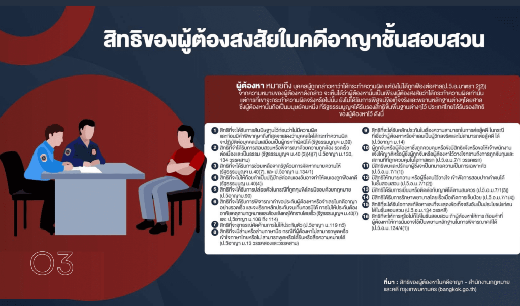 - สิทธิที่จะได้รับการสอบสวนโดยเร็ว และได้รับทราบการแจ้งสิทธิต่างๆ จากพนักงานสอบสวน (ป.วิ.อาญา มาตรา ๑๓๔)